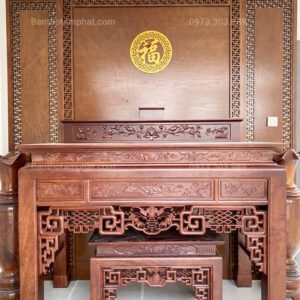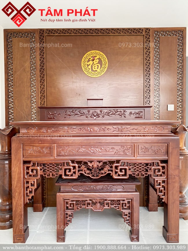 Bàn thờ Tâm Phát BT-1139 thiết kế với 4 chân trụ chắc chắn chạm trổ hoạ tiết vuông tạo cảm giác bề thế, vững chãi. Phía trước mặt bàn thờ phân làm 3 phần chính giữa – trái – phải tương ứng hoạ tiết cuốn thư – cành hoa đối xứng. Phần cổ bàn thờ có chiều ngang nhỏ hơn so với phần chân và mặt bàn điểm nhấn phía trên – phía dưới.